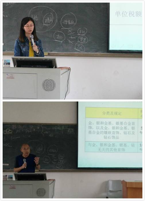 此次观摩课活动分别由5个教研室派出6位老师参加,其中审计教研室有2位教师,实训、财管、数学和会计教研室各有1位教师。第一位授课教师是审计教研室的周群老师,周老师讲授的课程是《税法(CPA)》,讲授内容为:第三章:消费税,其中包括:税目与税率、计税依据等内容。授课结束后,由陈东生老师为她点评,陈老师指出:周老师对所授内容掌握熟练,教授过程中思路清晰,重点突出,教学效果良好,同时也指出她的不足之处,如多增加与学生的互动等。