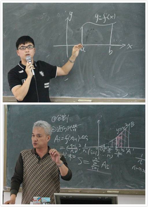 第五位老师是数学教研室的曾鹏老师,曾老师讲授的课程是《微积分II》,讲授内容为“定积分的概念”,主要通过例题的分析阐述定积分的概念。姜明启老师对曾老师的授课做出了评价,他认为曾老师讲课条例清晰,层次分明,案例分析合理,板书清晰,但同时也指出了其存在的问题,并以自己多年的授课经验从另一层次为大家讲授此概念。