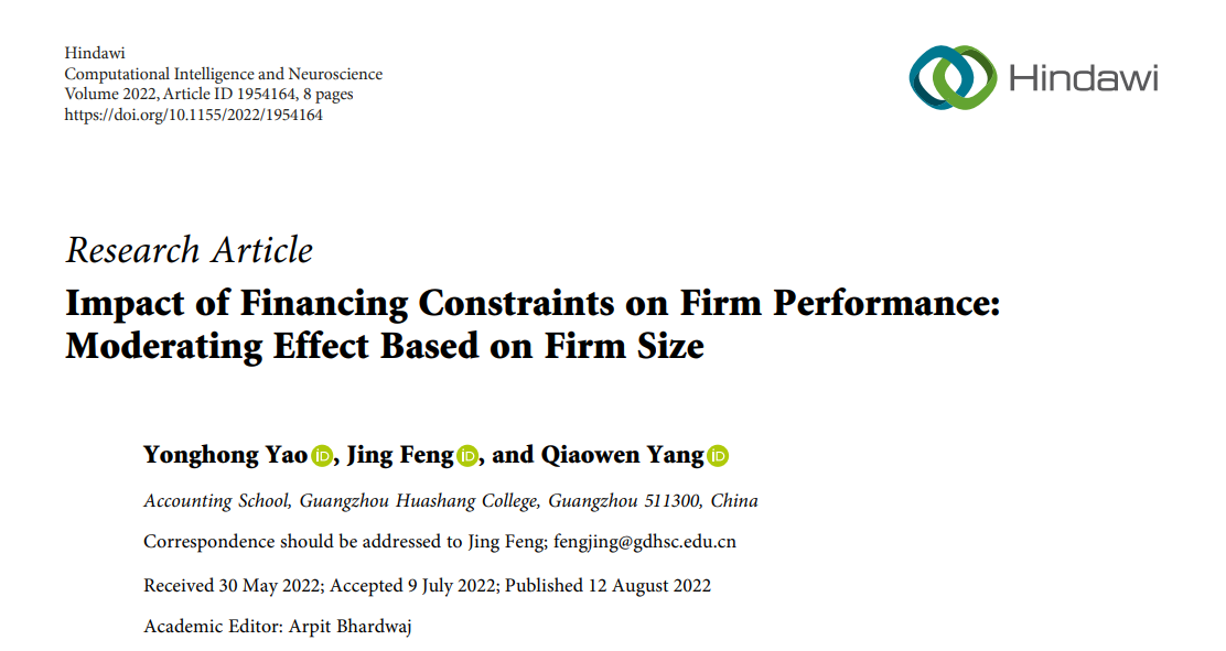 近日,国产又黄又猛青年教师姚永红(第一作者)、冯婧(通讯作者)、杨俏文合作发表了题为“Impact of Financing Constraints on Firm Performance:Moderating Effect Based on Firm Size”(企业规模对融资约束和企业绩效的调节效应研究—基于沪深A股上市公司的实证分析)的论文。该论文发表于《Omputational Intelligence and Neuroscience》期刊,该期刊属于SCIE检索期刊,最新影响因子为3.12,是中科院3区期刊。