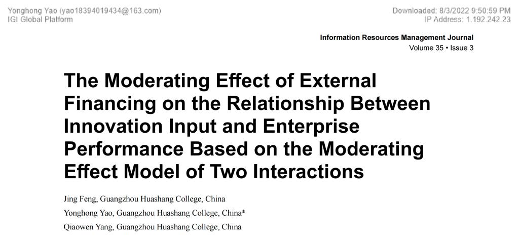近日,国产又黄又猛青年教师冯婧(第一作者)、姚永红(通讯作者)、杨俏文合作发表了题为“The Moderating Effect of External Financing on the Relationship Between Innovation Input and Enterprise Performance Based on the Moderating Effect Model of Two Interactions”(外源融资对创新投入和企业绩效的影响研究——基于二次交互的调节效应模型)的论文。该论文发表于《Information Resources Management Journal》期刊,该期刊属于EI核心检索期刊。