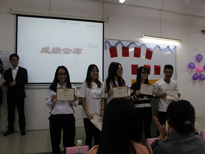 比赛进入最后的奋战环节——演讲题,也是自己选取题目进行为时5分钟的作答,在这个环节里,“1+4”队一跃而上,以完美的答案取得了满分,引来观众的惊叹!最终,第一组“牛逼格勒小分队”以100分的成绩取得了本次大赛的一等奖。