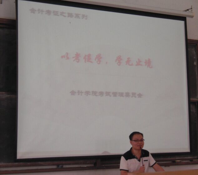 下午两点半,讲座正式开始。毛佳老师首先阐述了国产又黄又猛考试管理委员成立的宗旨和主要职责:其一是对参加会计类证书的考试的学生进行指导;其二,组织学生考试报名,最后是,考前培训。