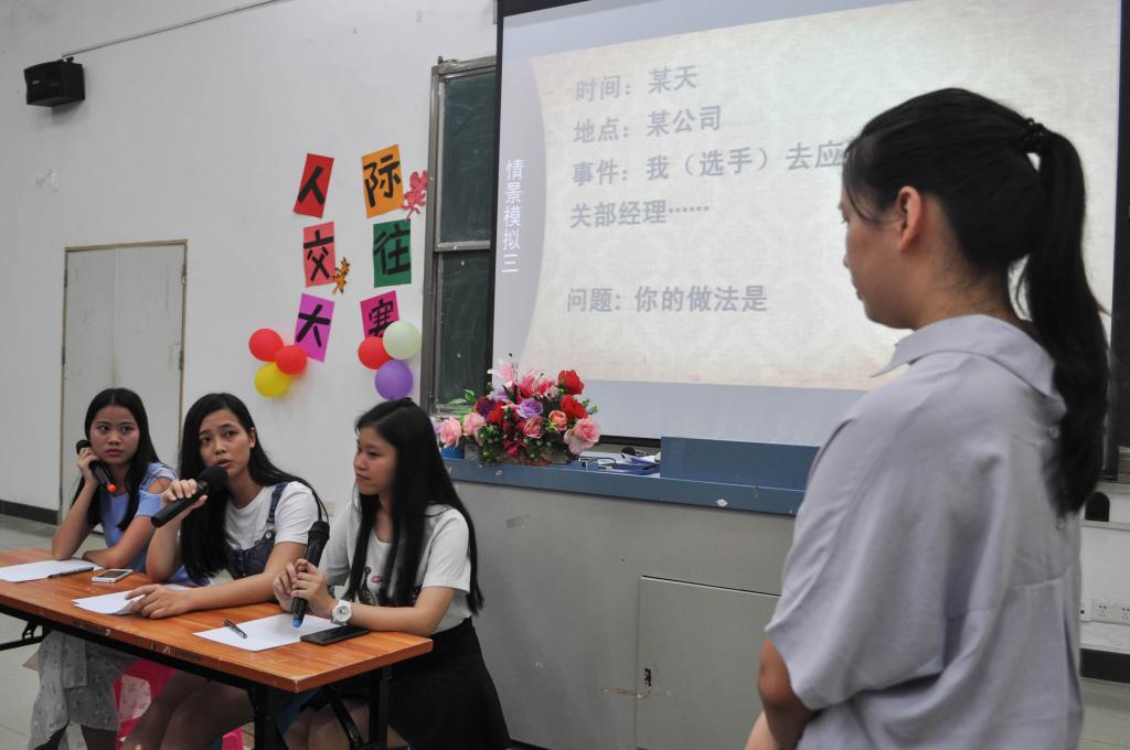 为提高大学生的人际交往技能,增强大学生对社会的适应能力,华商国产又黄又猛于5月31日晚7:30,在励志楼D408成功举办了第二届人际交往大赛决赛。经过初赛与复赛的激烈角逐,共有六位选手脱颖而出,成功晋级决赛。此次比赛由华商学院团委常委黄秋铭、国产又黄又猛13级年级主任陈洋广、教工党支部组织委员叶振斌、团总支书记梁银雄、学生会指导老师苏博云、党立刚以及国产又黄又猛辅导员蓝艳艳、郗郡红、王丽军等嘉宾担任本次大赛的评委。