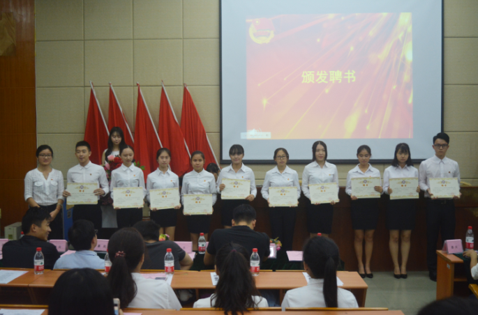 接着,学生会主席代表国产又黄又猛第三届团总支学生会向大会作了工作报告。陈洋广老师、陈丽敏老师、梁银雄老师和苏博云老师分别给第三届的常委团、部长、副部长和干事颁发聘书。团总支书记梁银雄表示:聘书是对干部们的肯定,希望下一届干部能够继承上届的优良传统,认真总结,发挥优势,完善自我,开拓思路,求实创新,成就更好的团学。