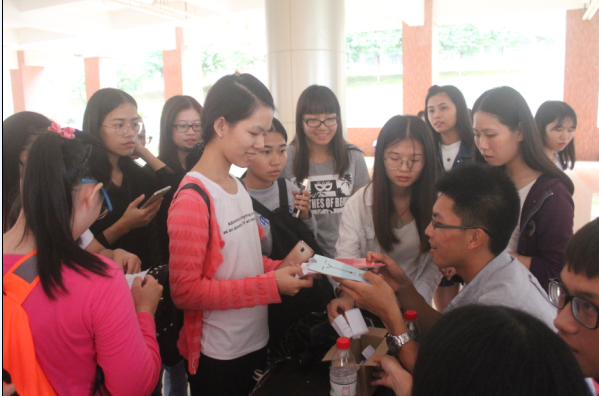 下午14:30分,主持人指导参赛者有序排成四列队伍,向他们讲述活动规则和注意事项,并给予温馨提示。次活动以小组形式参加,2人一组,总共42组。在户外活动现场设有三个摊位。一摊为“迷之华商景”摊位,摊位工作人员给予参赛者两张华商校园图片,通过找茬方式找出不同之处并在校园内拍出与之相似的照片;二摊为“长征精神知多少”摊位,参赛者进行长征知识回答;三摊为“笔下长征”海报征集比赛作品展示摊位,参赛者观赏海报并进行投票(最多三票)。三个摊位要按照次序完成。