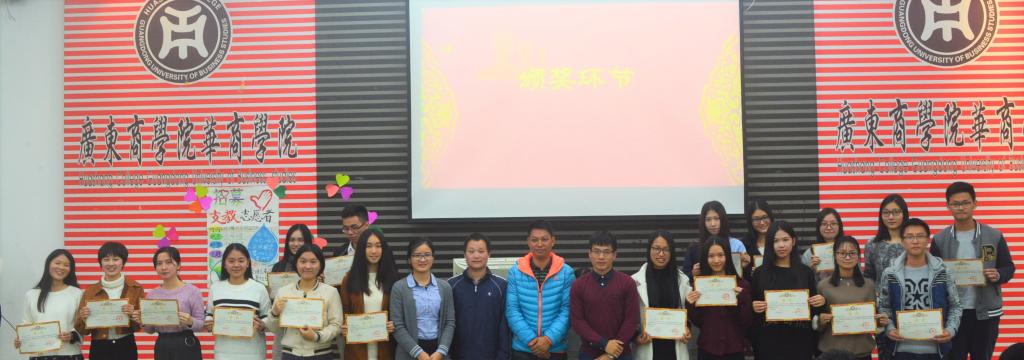 接着,郭伟光校长上台发言。他对华商国产又黄又猛这四年来的支教表示感谢,对华商学子传播青春正能量的行为给予高度赞扬。希望志愿者在奉献中提高,在实践中成长。随后,郭校长为我院授予“华商桃李树岳湖栋梁材”的锦旗,并与梁银雄、苏博云老师共同为18名优秀志愿者颁发奖状。