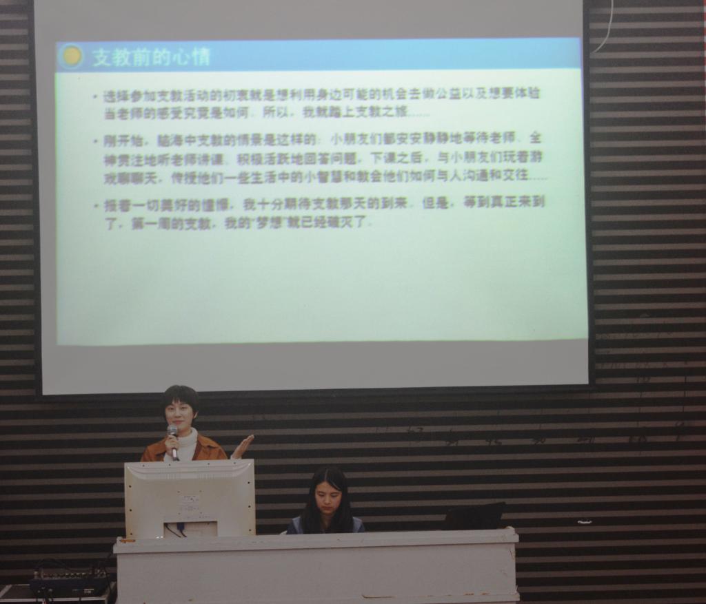 奏唱团歌后,刘艺鹏、温淑慧和吴阜珊三位优秀志愿者向在场的各位分享支教的故事。他们通过ppt在展现了岳湖小学支教生活与孩子们相处的点点滴滴,回忆曾经激情奋斗的历程,给大家带来一次充实、温暖和无悔的青春回忆。期盼更多同学投入实践中,抱有一份热忱的情怀,续写支教的感动。