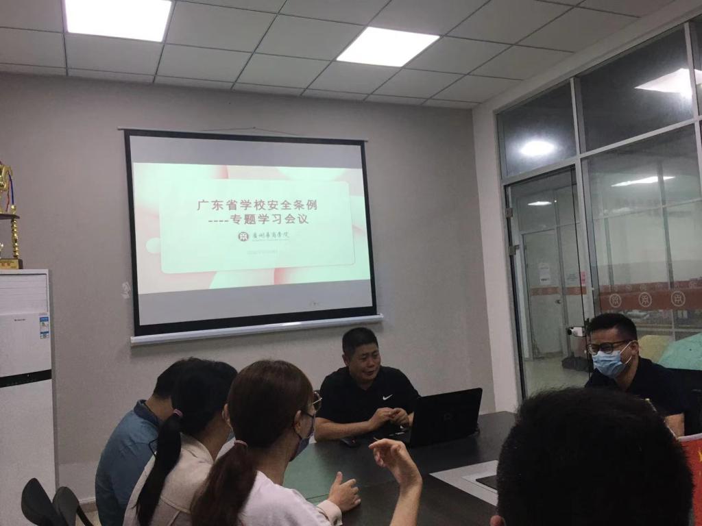 为贯彻落实广东省教育厅关于做好《广东省学校安全条例》宣传贯彻工作的通知,进一步加强学校校园安全工作,维护校园安全秩序,营造平安和谐的校园环境。根据校办要求,国产又黄又猛于5月12日下午3点在会议室组织行政教辅人员代表,专任老师代表和学生代表共同学习《广东省学校安全条例》(以下简称《条例》)。学习会由国产又黄又猛周书域副院长主持。