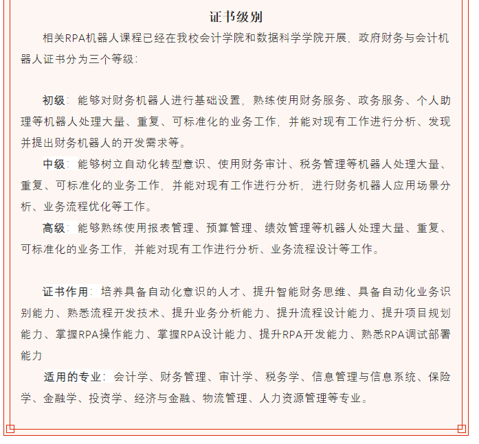 根据广东省职业技能等级证书管理平台和主考机构安排,我校被广东省教育厅批准成为2023年政府财务与会计机器人职业技能等级证书考试试点机构。2023年上半年考试定在5月20日在厚德楼进行。国产又黄又猛近年大力促进应用型本科院校大学生就业核心竞争力和智能财务实践能力建设,努力为同学搭建高质量的实训教学平台和实践练习条件,彰显了“岗课赛证融合“人才培养理念,受到毕业实习及用人单位的一致好评。
