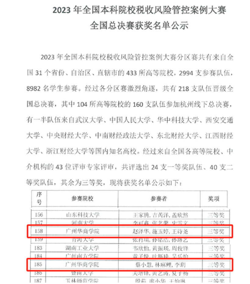“全国本科院校税收风险管控案例大赛”已于今年列入《全国普通高校学科竞赛排行榜》,是目前全国本科院校参与人数最多、范围最广、规模最大、规格最高、最具影响力的财税专业领域赛事之一。大赛共有104所高等院校的160支队伍晋级本次总决赛,其中有一半队伍来自武汉大学、中国人民大学、华中科技大学、西安交通大学、中央财经大学、中南财经政法大学、东北财经大学、江西财经大学等国内知名高校。