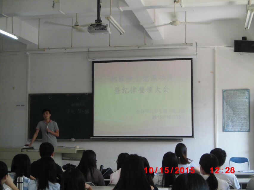 为进一步严肃党课纪律,积极配合学院党校开展积极分子党课培训工作,国产又黄又猛学生第三党支部于2015年10月15日在励志楼A203举行“积极分子动员暨纪律整顿大会”。出席本次会议的人员有国产又黄又猛学生第三党支部4名支委和13级各班积极分子共51人。本次会议由纪检委员曾林冠同志主持。