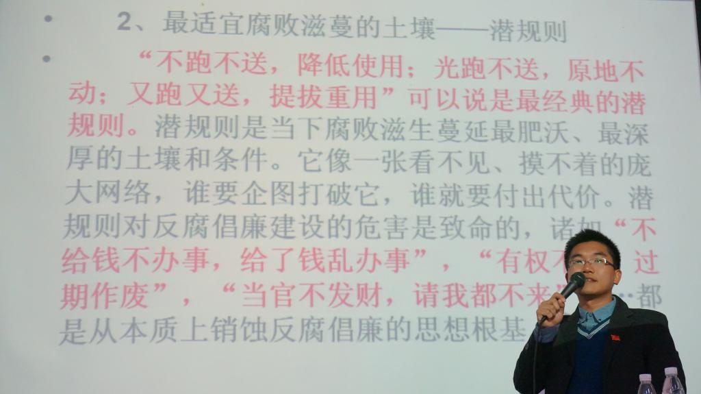 随后,李书记为我们总结了当今社会腐败犯罪的十五个新动向,比如贪官年轻化、团体腐败、学术腐败等,进而引出腐败问题产生的深层原因及其危害。李书记还为我们播放了腐败大贪官曹鉴燎的警示教育视频,并以朱镕基总理的一番话为我们重申了反腐倡廉工作的重要性和困难性,它的艰难体现在必须要有坚定的信念,不畏牺牲,以换来国家的长久稳定发展和老百姓对我们党和国家的事业的信心。