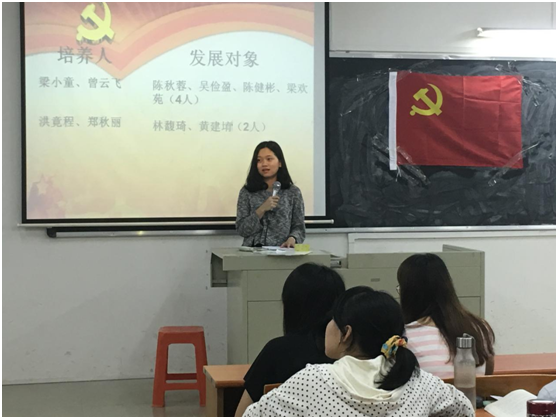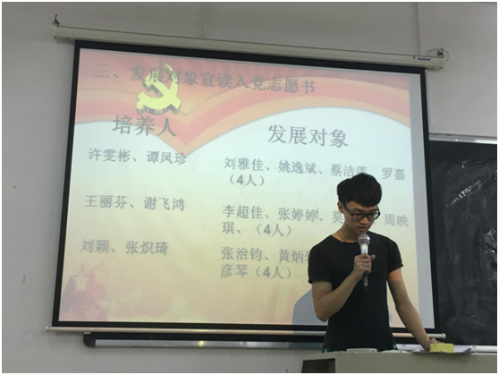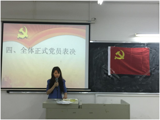 大会第四项,由冯金兰书记主持全体党员投票仪式,郑秋丽、叶心怡同志顺14票赞成0票反对的投票下,顺利的成为正式党员;刘雅佳、姚逸斌等14名发展对象在14票赞成0票反对下顺利加入中国共产党,成为预备党员。
