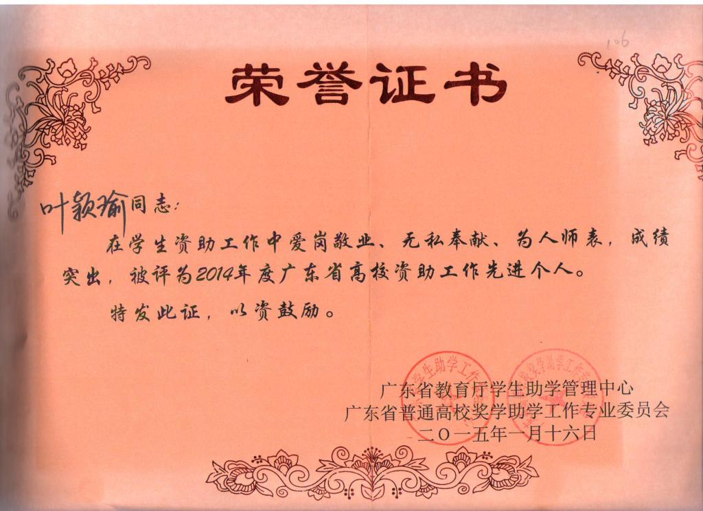 热烈祝贺国产又黄又猛叶颖瑜老师获得2014年度广东省普通高校奖助学工作先进个人称号!