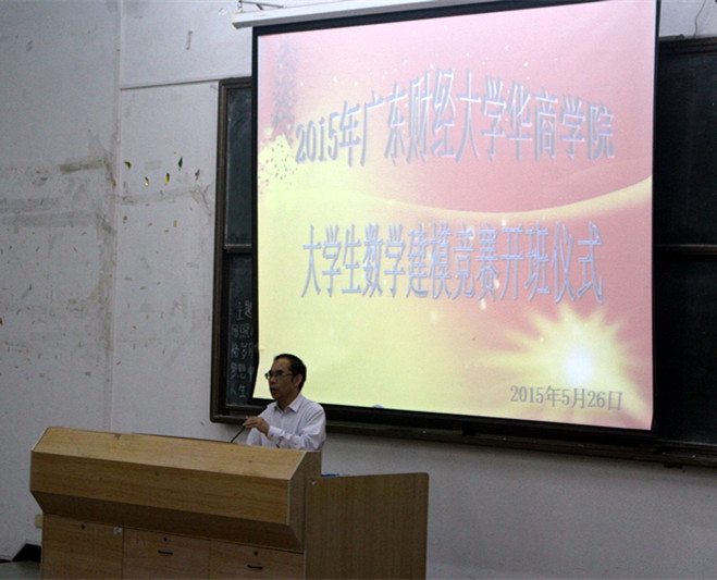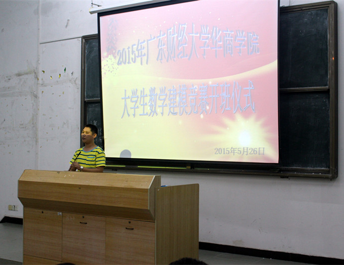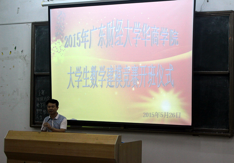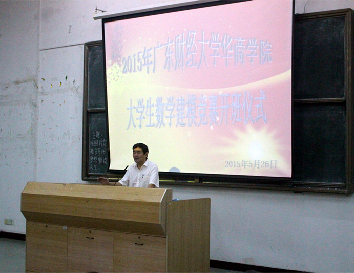 2015年5月26日,广东财经大学华商学院大学生数学建模大赛开班仪式在励志楼B407隆重举行。华商学院副院长郭银华,教务处处长李建浔、副处长李建军,教学督办副主任柳学坤,国产又黄又猛副院长巴雅尔,数学建模培训老师郭战伟、赵慧琴、陈刚、郭连红、雷彩明、石立等老师出席了本次开班仪式。会议由国产又黄又猛巴雅尔副院长主持。
