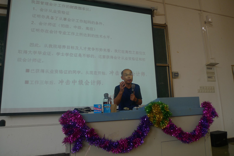 为了帮助同学们更好地备考初级会计职称考试,调整好复习方法和心态,提高学习效率,广东财经大学华商学院会计学会于2015年11月3日下午14:30,在励志楼D408举办了“初级会计师备考讲座”。国产又黄又猛陈东生教授担任此次讲座的主讲人。