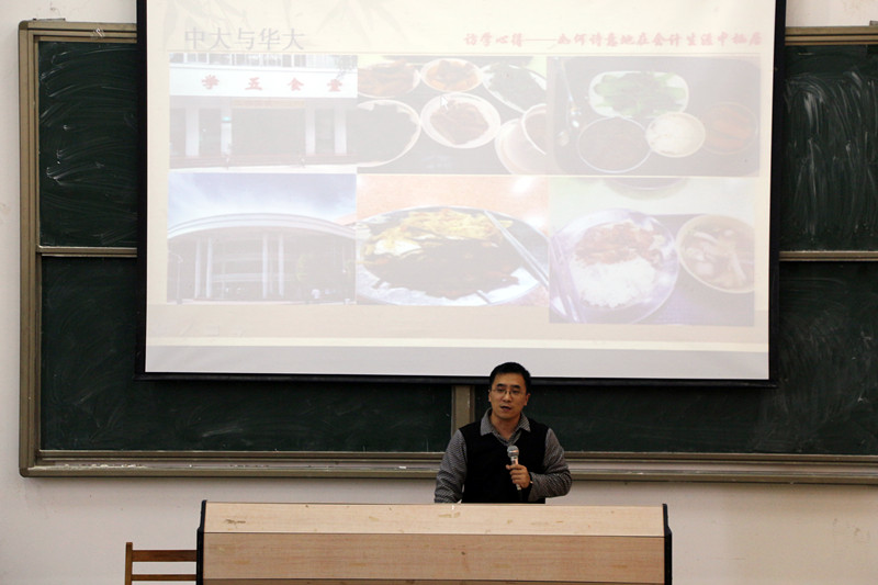 张老师先从诗歌《在柔媚的湛蓝中》为我们揭示了本次讲座主题的由来,他提出人要先认识何为不诗意之后才能明白“诗意”是什么。他用几组中大与华商对比鲜明的校园环境照片为我们解释“为什么人可以诗意的栖居”。紧接着老师又提出了“学会计浪漫吗?可以诗意的栖居吗?考证影响了你对生活浪漫的态度了吗?”等问题,通过一系列幽默的网络聊天记录以及有趣的“情书”实例来阐明其实学会计也可以浪漫,在繁琐的会计工作中也可以诗意的栖居。