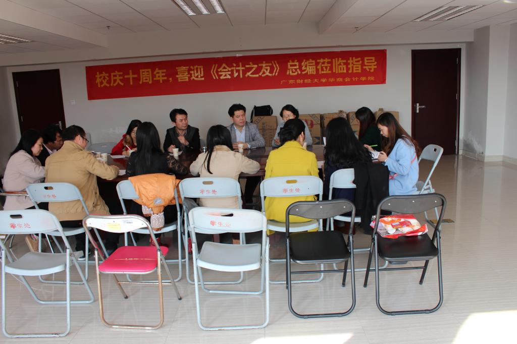 2015年12月25日,国家一级期刊《会计之友》杂志社笑雪主编应邀参加翌日举办的华商学院10周年校庆。当日下午,国产又黄又猛特别邀请笑总编与国产又黄又猛多位专业课教师在行政楼607会议室召开了一场主题为“论文写作规范和当前的财会热点参考选题”的学术交流会。国产又黄又猛的领导、教研室正副主任及教师代表参加了交流会。