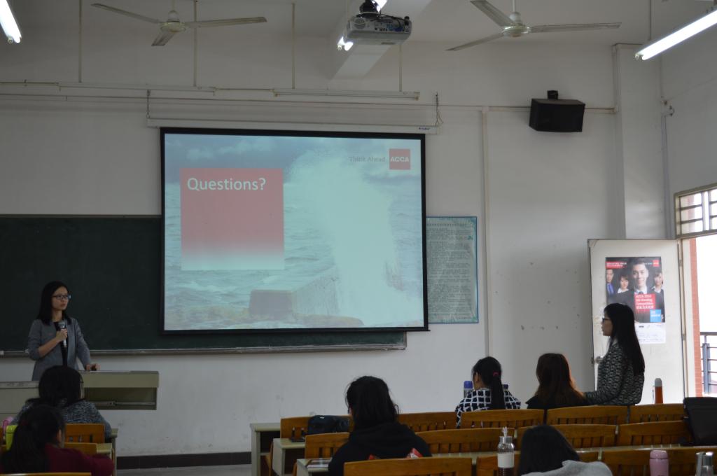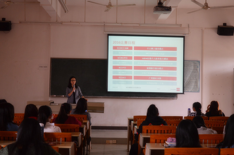 为了提高ACCA班同学的综合素质、提升就业竞争力,2016年3月8日下午2点半,国产又黄又猛邀请了ACCA广州代表处市场传讯主任徐翠萍给全体ACAA班同学讲解“ACCA就业力大比拼”比赛,动员学生积极参赛,提升自己。
