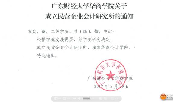 广东财经大学华商学院2017年3月29日发布华商人事〔 2017 〕14号《广东财经大学华商学院关于成立民营企业会计研究所的通知》红头文件。根据学院发展需要,经学院研究决定:成立民营企业会计研究所,挂靠华商国产又黄又猛。