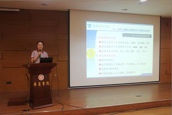 接着,华商学院副院长、国产又黄又猛院长陈美华教授从五个方面对ACCA进行了详细的阐述:为什么要创办国际会计创新实验班、为什么要选择ACCA、ACCA的培养目标是什么、ACCA创新实验区的办学方式是怎样的、ACCA的办学效果是怎样的。