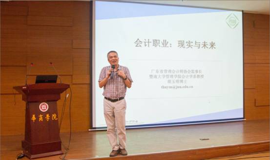 随后,协会监事长胡玉明教授作了题为“会计职业:现实与未来”的精彩报告。胡教授通过过去的“账房先生”和当今的“财务机器人”的历史联系,生动形象地向刚刚开启大学生活的新生们介绍了“会计师”的职业现实与未来的变化。胡玉明教授提到:“财务机器人”的到来可能会陆续取代财务会计人员的常规性工作,使得企业对财务会计人员的岗位需求大大减少。因此会计从业人员需要转变观念,拓宽知识面,增长职业判断能力、市场意识和商业智慧,而GAMA创新班的设立正是为了培养适应经济社会发展需要的管理会计人才,为同学们未来的职业发展奠定坚实的基础。