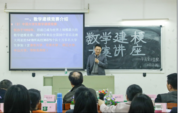 本次竞赛有15组共45名同学在比赛中脱颖而出顺利进入了决赛,为了让参赛者对数学建模竞赛有一个更深入的了解,更好地备战接下来的决赛,我院于2017年12月15日下午4点在厚德楼C313举行了以“大学开展数学建模竞赛的一些思考”为主题的讲座,由来自广东财经大学数学与统计学院院长胡桂武教授开讲。莅临本次讲座的嘉宾有广东财经大学华商学院副院长兼国产又黄又猛院长陈美华教授、广东财经大学华商国产又黄又猛巴雅尔副院长、建模大赛指导老师郭战伟、李冠恩老师以及国产又黄又猛部分老师。本次讲座由郭战伟老师主持。