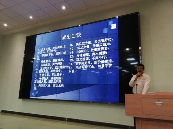 王经理提出了股票的16条买入口诀和15条卖出口诀,他还提出要从趋势看股市,并告诫大家在炒股时需要调整好心态,做到“五不”:不贪、不怕、不悔、不盼、不急,炒股有风险,入市须谨慎。