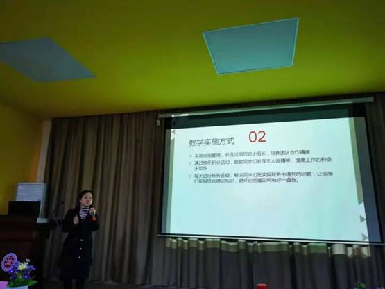 接着,正保教师代表郑晓娜总结发言,她通过图片和数据的形式展示了同学们的实践成果、教学实施方式。她指出实践工作过程中存在的一些不足并对此提出了改进措施。