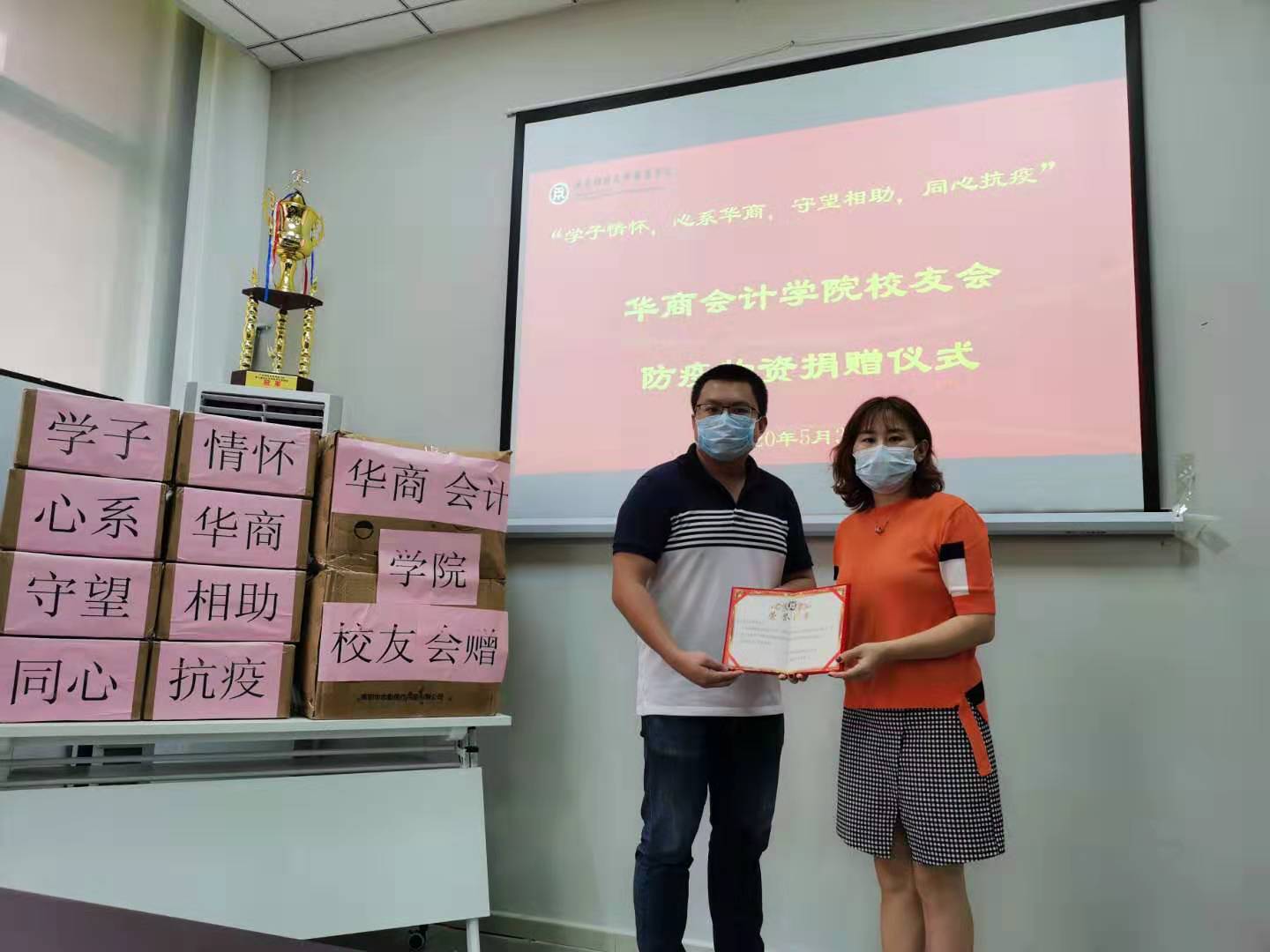 防疫物资捐赠仪式在华商国产又黄又猛会议室举行。校长助理、国产又黄又猛副院长许娜,国产又黄又猛学工办副主任陈洋广、校友工作办主任吴泽佳等出席了捐赠仪式。副院长许娜代表国产又黄又猛接受捐赠并向华商国产又黄又猛校友会颁发了捐赠证书。