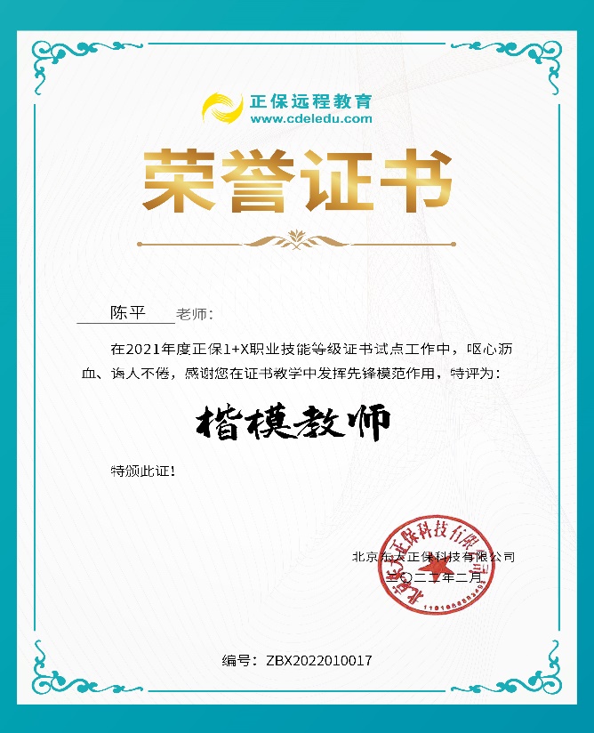 陈平老师在2021年度正保1+X职业技能等级证书试点工作中被评为“楷模教师”。