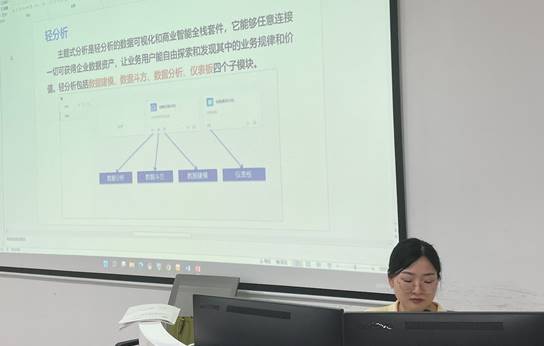 接下来,伍程程老师则主要侧重于大数据的可视化分析技术的应用讲解。伍程程老师以我们课程中的存货管理模块为例,针对存货管理过程中的数据分析和可视化呈现流程进行了演示。