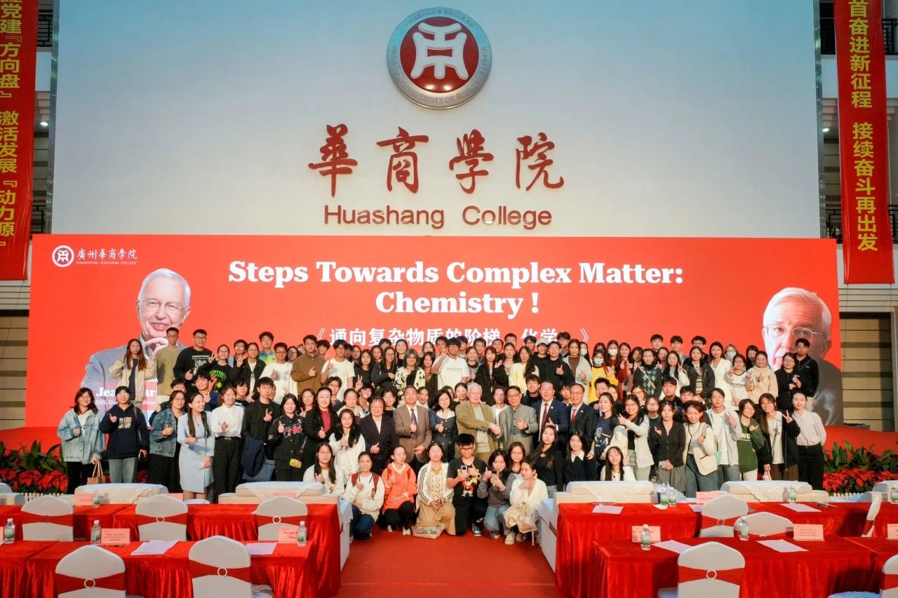 11月21日,诺贝尔化学奖获得者、超分子化学奠基人之一、法国科学院院士、中国科学院外籍院士、美国国家科学院外籍院士、学校荣誉校长Jean-Marie Lehn教授时隔五年再访华商,并为华商师生作《通向复杂物质的阶梯:化学!》专题讲座。广州华商学院校长陈新滋院士、党委书记陈玉欢、副校长吕峻闽,校长助理及各职能部门负责人、各二级学院负责人参加本场讲座。本场讲座采取“线上+线下”的方式,现场600多名师生代表,线上两个平台共吸引2万多名受众共同聆听大咖的精彩讲座。讲座由校长陈新滋院士主持。