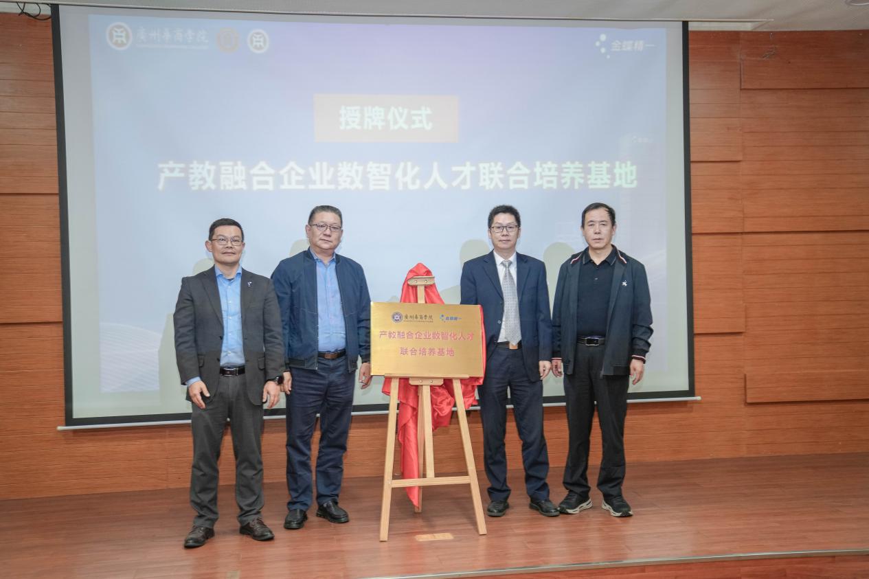 随后,广州华商学院与金蝶精一信息科技服务有限公司共同成立了产教融合企业数智化人才联合培养基地。这一举措旨在通过构建校企命运共同体,扩大就业创业、提升人才培养质量、推进经济转型升级、培育发展新动能。在授牌仪式上,双方代表共同上台见证了这一重要时刻的到来,现场掌声雷动。