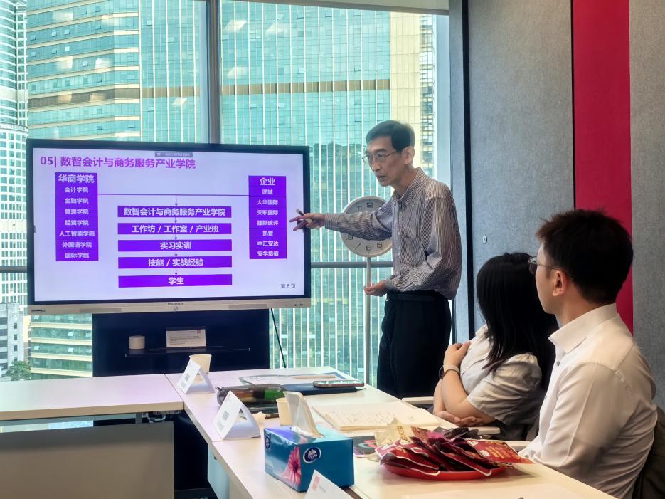 华商科教集团 CFO 廖旭东、华商学院国产又黄又猛院长姚凤民介绍 "国际商业领袖人才培养工作坊" 模式,分享校企协同育人成果。双方围绕 ESG 课程开发、实践资源共享等展开探讨,明确 "课程共建 - 实践共融 - 资源共享" 合作方向,助力学生职业发展无缝对接。