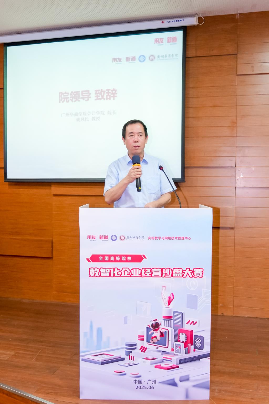 广州华商学院党委副书记、纪委书记、副校长吕峻闽教授率先致辞,吕副校长强调,本次大赛不仅为参赛选手提供了展示数智化管理能力的平台,更是推动高校财经教育改革,培养适应新时代需求的数智化财经人才的重要途径。他鼓励参赛选手珍惜比赛机会,全力以赴,通过比赛深入学习和实践数智化管理的精髓,真正做到以赛促学、以赛赋能。