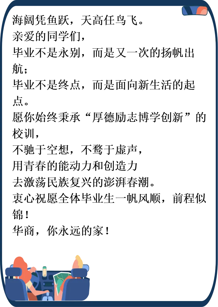 (五)文明离校,严守公德。离开校园,我们承载着民族的未来和国家的希望,奔赴祖国的四面八方。身在校园,作为学长学姐的我们,应该自觉的加强自身修养,做一名抱诚守真、文明守信、遵规守纪的毕业生,以自己的实际行动为师弟师妹们做出表率、树立榜样。