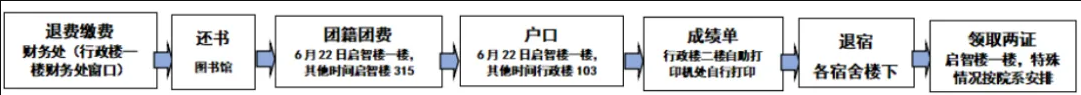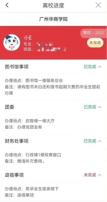 显示“已完成”的项目不用同学们处理,显示“未完成”则需前往相应地点完成相关手续,具体来说:退费缴费(财务处,行政楼一楼西边);还书(图书馆);团籍团费(6.22启智楼一楼,其他时间启智楼315);户口(6.22启智楼一楼,其他时间行政楼103);退宿(各宿舍楼下宿管处)。