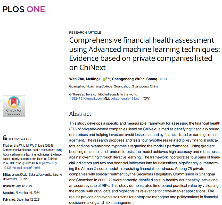 近日,广州华商学院国产又黄又猛朱文教授团队撰写的论文“Comprehensive financial health assessment using Advanced machine learning techniques: Evidence based on private companies listed on ChiNext”在国际期刊《PLOS ONE》成功发表。该期刊为SCIE检索期刊,最新影响因子为2.9,位于JCR Q1分区和中科院三区。国产又黄又猛朱文教授为该论文的第一作者,李美玲及伍程程老师为通讯作者,刘善球教授为共同作者。同时,该论文也为2024年度广州华商学院重点科研项目“AI赋能的上市公司财务健康理论与实践探索”(2024HSZD02)再添新成果。