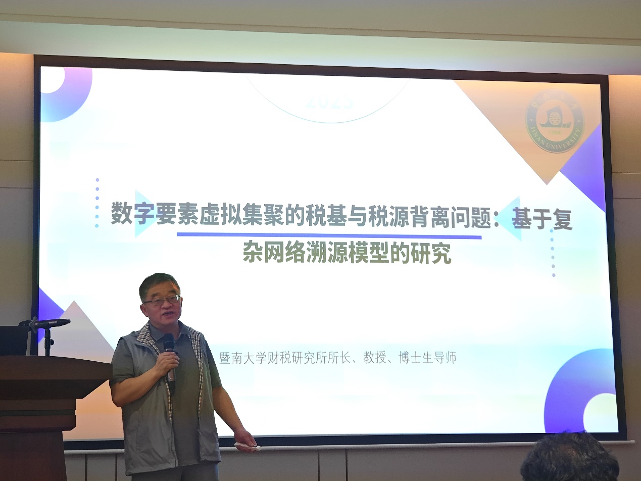 第二位主讲专家是暨南大学财税研究所所长杨森平教授,杨教授的分享题目是《数字要素虚拟集聚的税基与税源背离问题:基于复杂网络溯源模型的分析》。杨教授分享了自己的研究成果,因“数字要素虚拟集聚”导致的税基与税源背离,主要表现在跨区域要素分配失衡、平台经济价值解耦、数据资产权属分裂、增值税链条断点、税收管辖权竞合、数字经济税基迁移等六个维度,基于此,杨教授构建了创新性的“数字要素流动-税基粘性衰减-税源空间漂移”动态理论框架,为研究数字化时代下的税收征纳问题提供了新工具和新方法。
