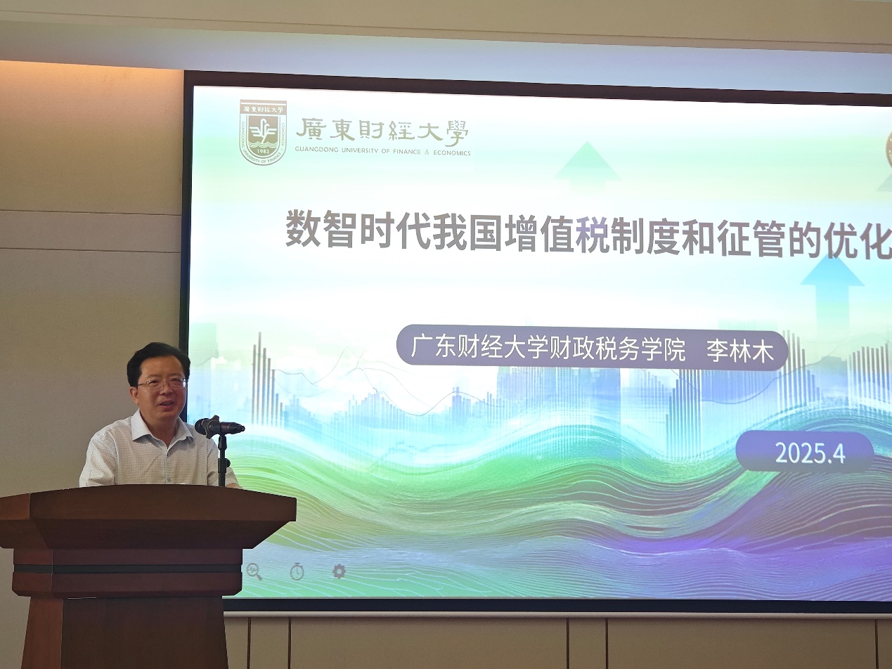 随后研讨会进入主旨分享环节。会议邀请到的第一位专家是广东财经大学财政税务学院院长李林木教授,李教授的分享主题是《数智时代我国增值税制度和征管的优化》。新《增值税法》已于2024年年底颁布,于2026年起正式施行,在此背景下,李林木教授分享了他对优化我国现行增值税税制的研究,结合OECD成员国的经验,从纳税人身份定义、征税对象范围、税率设置、计税方法、税收优惠、征收管理等六个维度剖析了优化税制的角度和方向,为高校财税教学与增值税的税制研究提供了宝贵的经验参考。