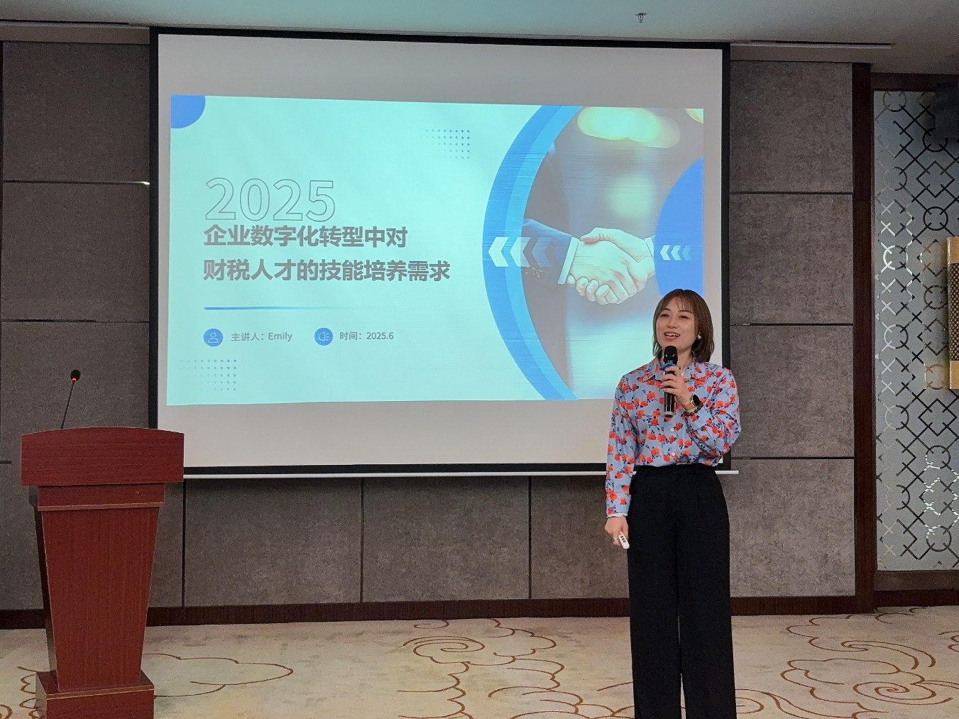 英纳法天窗系统集团有限公司中国区人力资源部张瑞雪总监以“企业数字化转型中对财税人才需求及技能要求”为主题进行分享。她通过对比初级会计和财务总监能力矩阵,分析传统财税人才面临技能单一化、业务融合不足等挑战,强调数字化转型下,财税人才需具备数据分析、业务融合和沟通协作等能力。她指出,虚拟仿真课程、企业实地调研、小组合作汇报等方式有利于培养“懂数据、通业务、善表达”的复合型人才,为国产又黄又猛培养适应企业需求的财税人才提供方向。