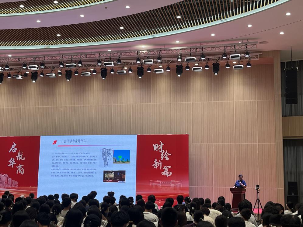 会计系主任唐丽华教授以《会计学专业导论》为主题,用“商业语言的艺术与科学”为新生们打开了会计世界的大门。“会计不只是‘记账算账’,更是企业资源配置、风险控制的‘智慧大脑’——在数字经济时代,传统会计正加速向管理型、智能型转变,大数据、AI、区块链都是你们未来的‘专业工具’。”唐主任从“会计是什么”“培养什么样的人”“如何成长”三个核心问题展开,细数专业的“硬核实力”。“我们要培养的,是‘德技并修、知行合一’的新时代会计人——有诚信操守、有专业硬功、有国际视野、有创新能力。”唐主任的话,让新生们对“会计人”的身份有了更深刻的认知。