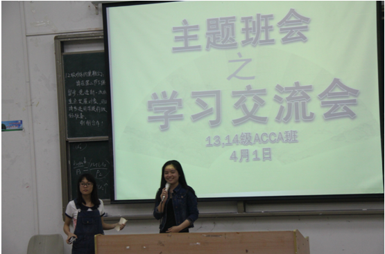 4月1日晚7:00至9:00,国产又黄又猛2013级ACCA班与2014级 ACCA班在励志楼A108室举行了学习交流会。两个ACCA班80多名同学都参加了本次学习交流会。另外还邀请了2014级会计系辅导员严瑶老师和2014级ACCA班的班主任杨悄文老师担任嘉宾。