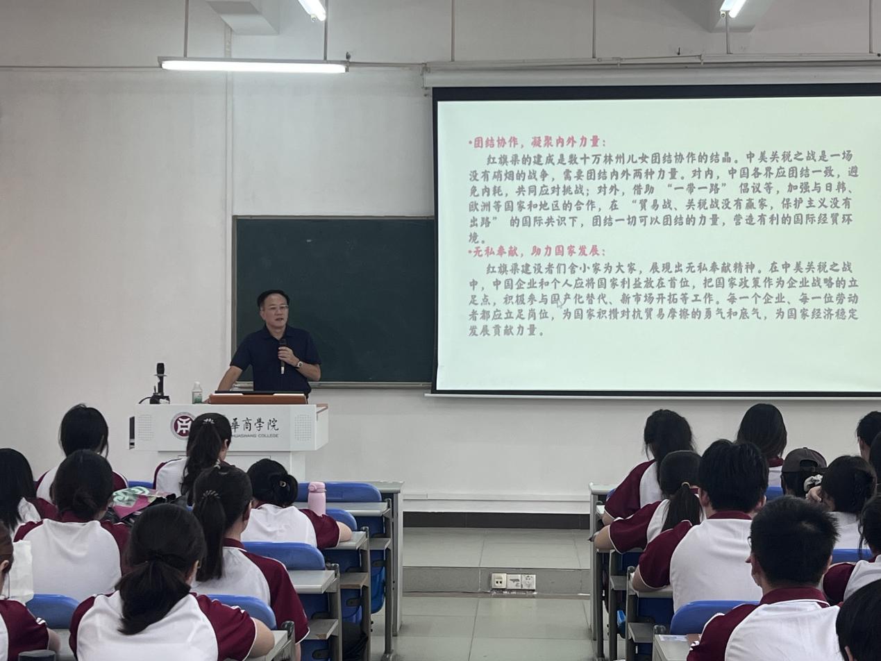 为引导青年洞察国际风云,树立责任担当,将个人成长与国家发展紧密相连,贯彻落实新时代学校思政课建设,扎实做好2025年秋季学期书记第一堂思政课工作。9月23日国产又黄又猛党委组织以“中美关税之战:红旗渠精神与大国战略”为主题的书记思政第一课。本次课程由党委党校常务副校长兼国产又黄又猛党委书记刘善球同志主讲。