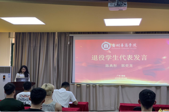 在退役学生代表发言环节,退役学生代表陈典彤、郭奕龙同学分别上台分享了他们在部队中的成长经历、收获与感悟。他们结合自身经历,深情讲述了军旅生活中的艰辛与快乐,以及军人身上所具备的纪律、责任和荣誉感。退役后,他们将继续保持军人的本色,努力学习专业知识,为校争光,为国家的繁荣富强贡献自己的力量。