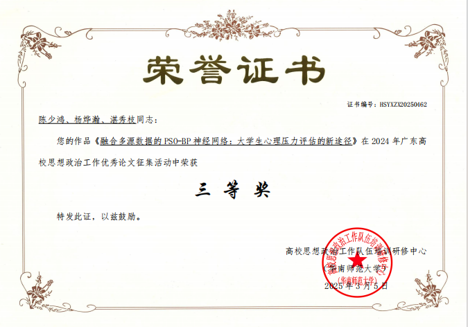 陈少鸿、杨烨瀚、湛秀枝合作的论文《融合多源数据的PSO-BP神经网络:大学生心理压力评估的新途径》荣获优秀论文“三等奖”。该研究通过技术创新精准评估学生心理状态,为心理健康干预提供科学依据。王丽军、杨烨瀚的案例《从“留学梦碎”到“精神困境”:高校延毕生心理危机与家校共育之路》获“三等奖”,通过真实案例剖析家校协同机制在心理危机干预中的关键作用。此外,王蓓的案例《打破僵局,共筑“雅”舍——新时期高校宿舍文化建设个案探究》获评“优秀奖”,聚焦宿舍文化育人功能,探索学生社区管理新模式。