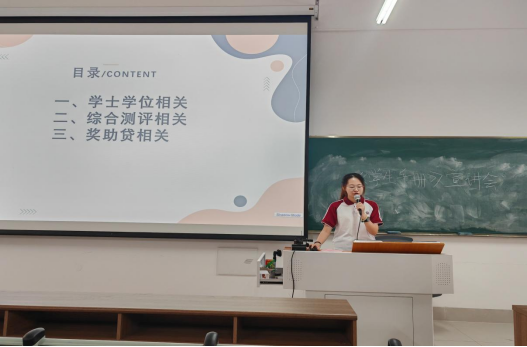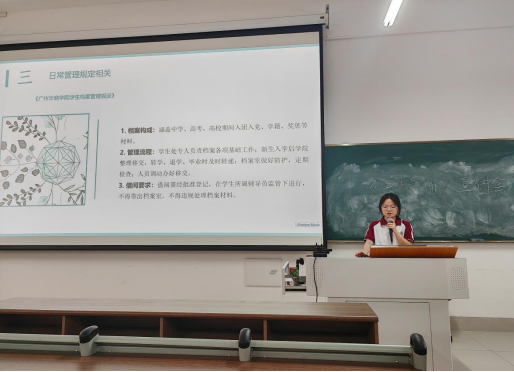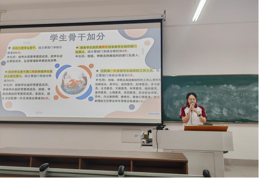 在本次宣讲会中,曾慧妍同志主要围绕《广州华商学院学生学年综合测评办法》、《关于学生学年综合测评评选办法补充通知》、《广州华商学院先进班集体、优秀生、优秀学生干部评选奖励办法》三个方面展开宣讲,介绍了学生学年新综合测评的组成部分和有关的计算方法,以及先进班集体和优秀个人的评选条件,帮助同学们深入了解评优评选的方法。