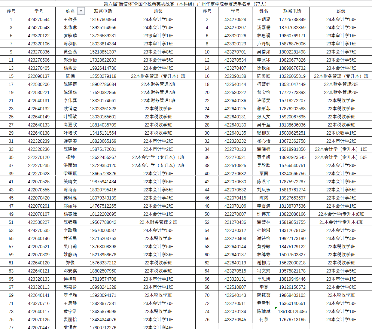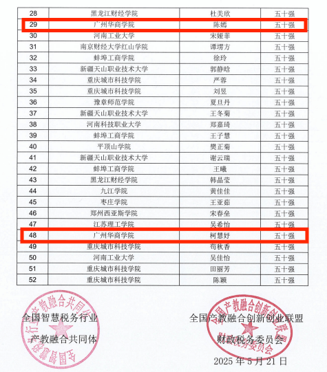 最终,广州华商学院以团队总分名列全国第三名的好成绩获得团队一等奖;我校的参赛选手中,共有8名选手的个人分数位列前50名,他们将获得“全国个税师(个税普法大使)五十强”的荣誉。