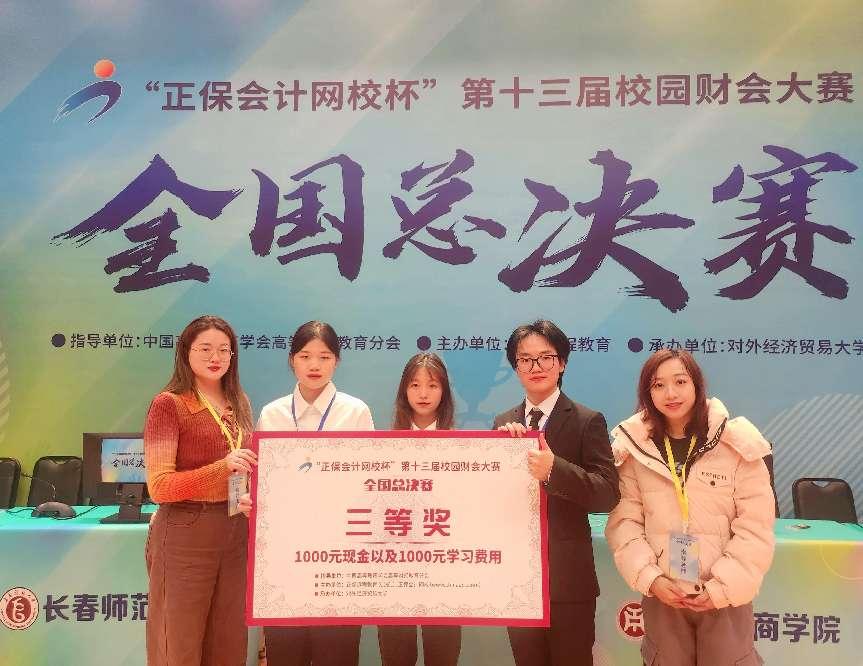 2024年12月7日,“正保会计网校杯”第十三届全国校园财会大赛全国总决赛于对外经济贸易大学圆满落幕。我院何子昉、周敏、罗永桂三位老师带领22本会计学2班杨普仕、21本会计学5班邹丽娴、21本会计学(专升本)14班蓝金花组成的团队荣获全国三等奖。